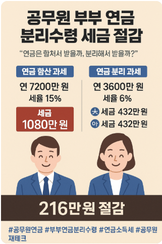 | 분리 과세 시 총액 | 각자 3,600만 원 (하위 세율 적용) | ✅ 세금 절감 효과 발생 |