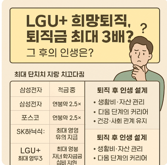 오늘은 LGU+ 희망퇴직 제도의 실제 내용과 퇴직금 수준, 그리고 퇴직 이후 인생 2막을 준비하는 현실적인 전략까지 깊이 있게 정리해드릴게요.